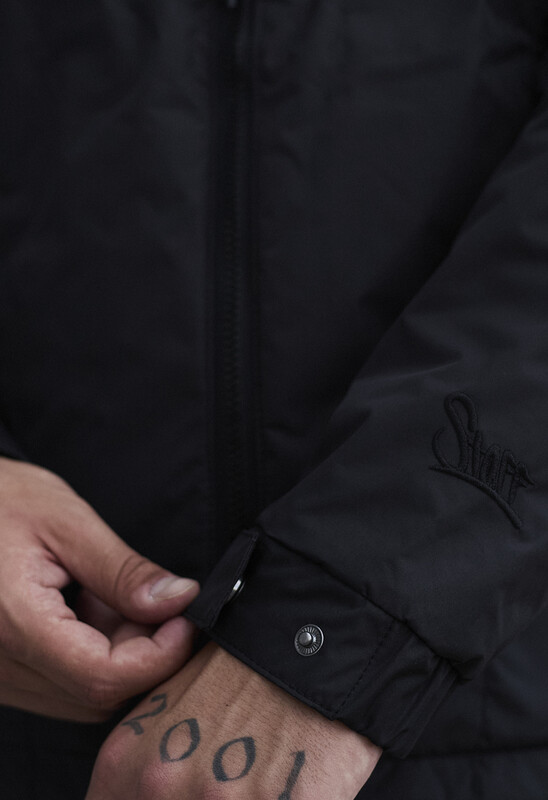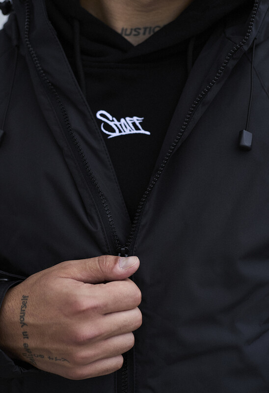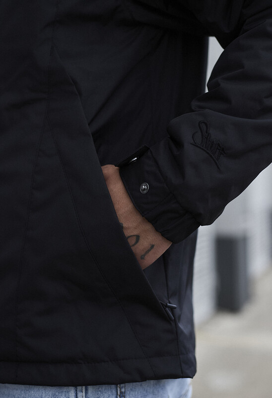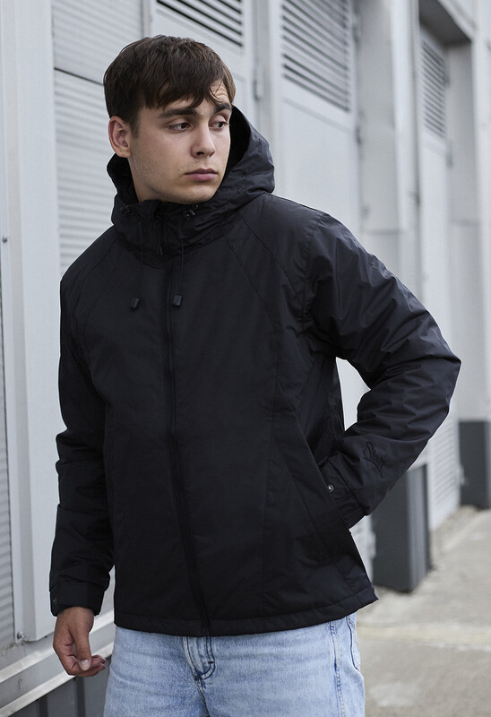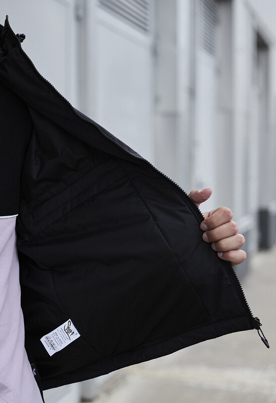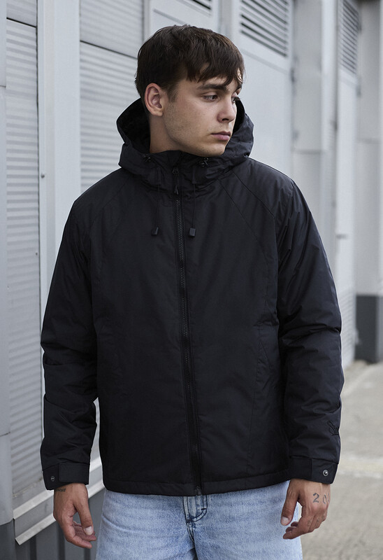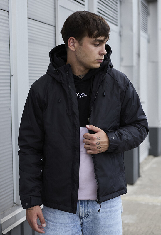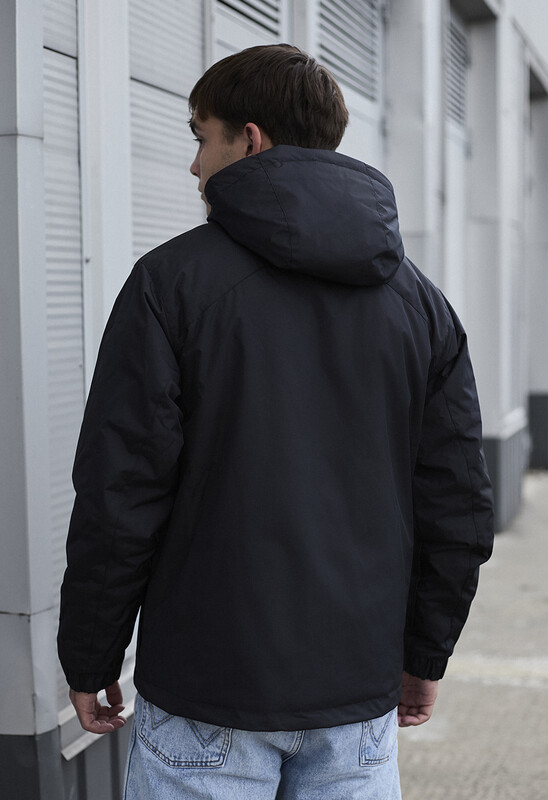 - висока горловина переходить у капюшон, об'єм якого допомагають регулювати шнури із пластиковими фіксаторами;