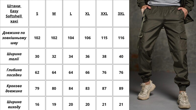 Внизу штани фіксуються за допомогою еластичних манжетів. Вгорі виріб регулюється за допомогою резинки та шнура.