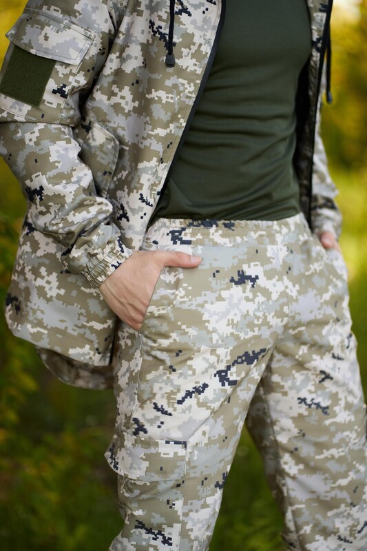 2 бічні прорізні кишені для рук, 2 накладні кишені на липучках. Внизу виріб регулюється за допомогою еластичного манжета на резинці