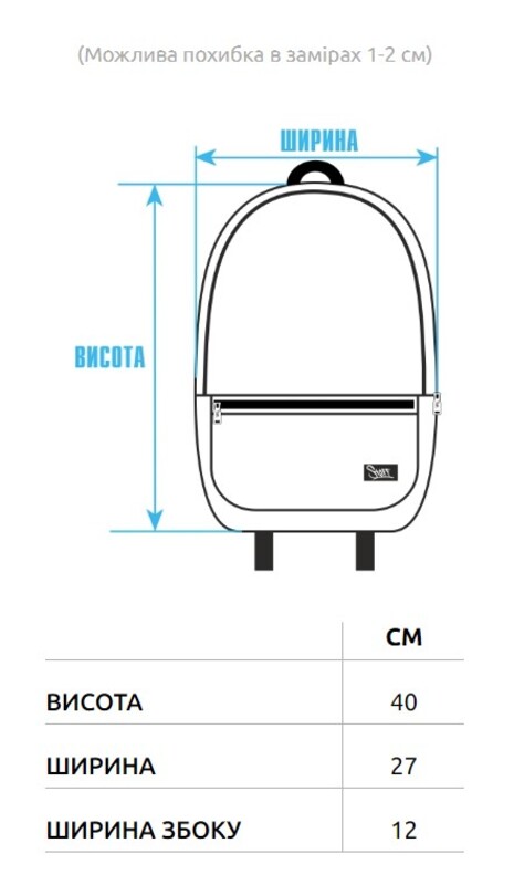 - розмір: висота 40 см, ширина 27 см, ширина збоку 12 см;