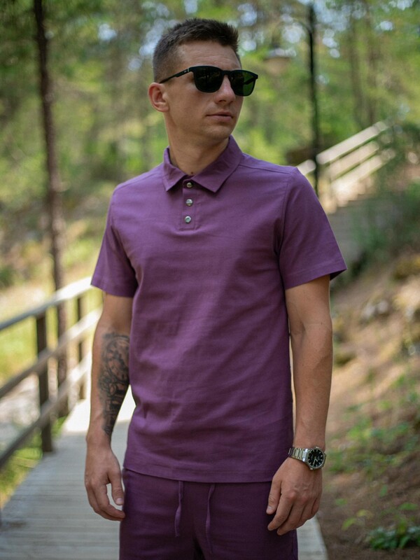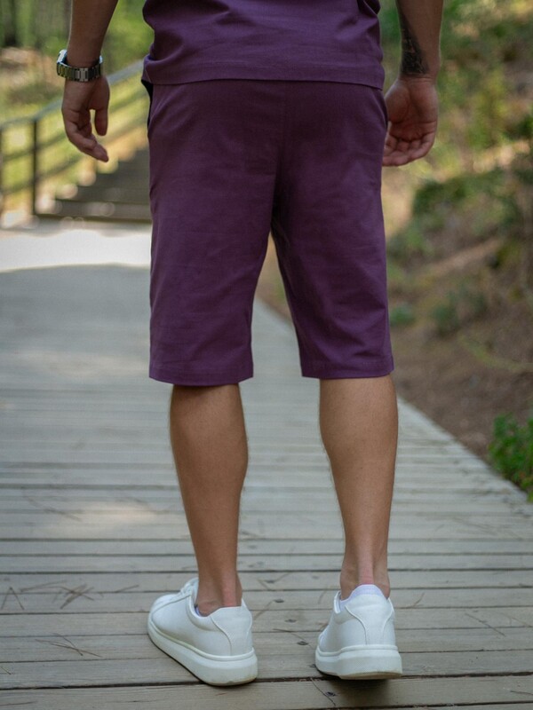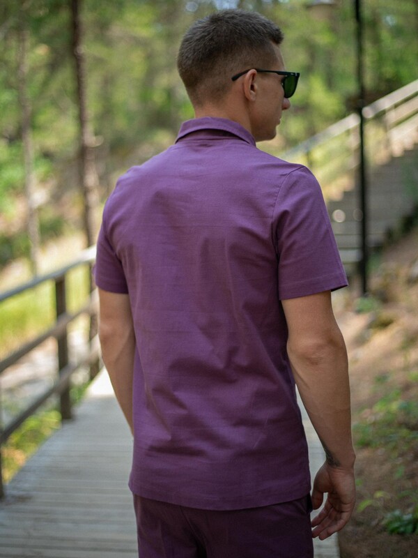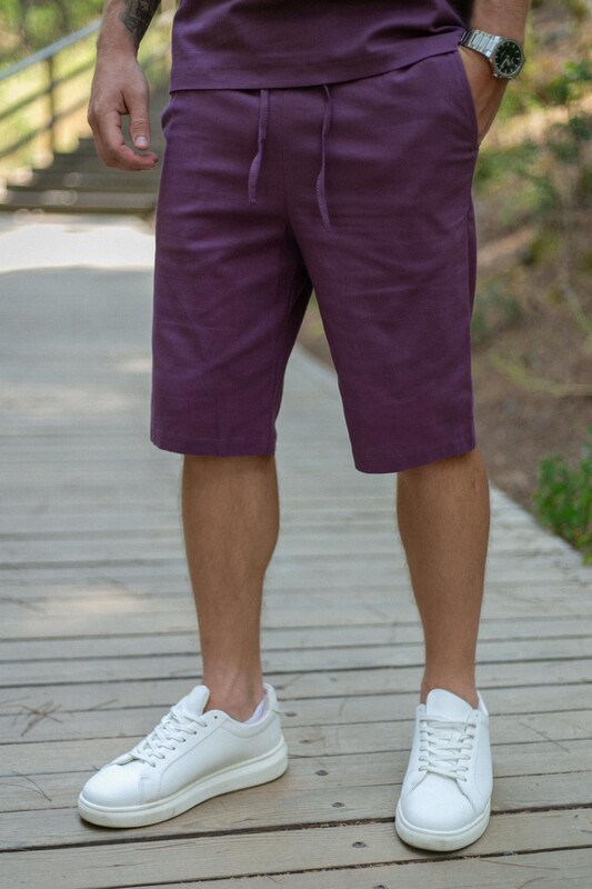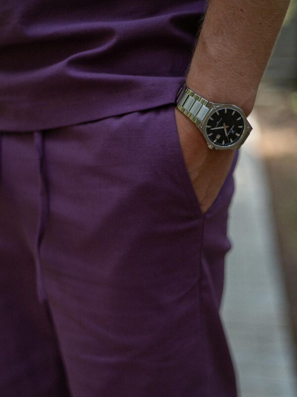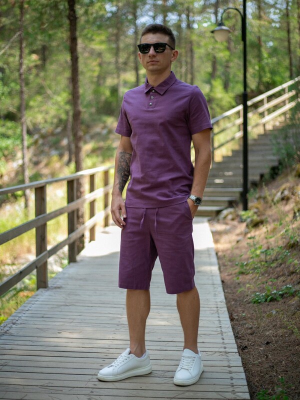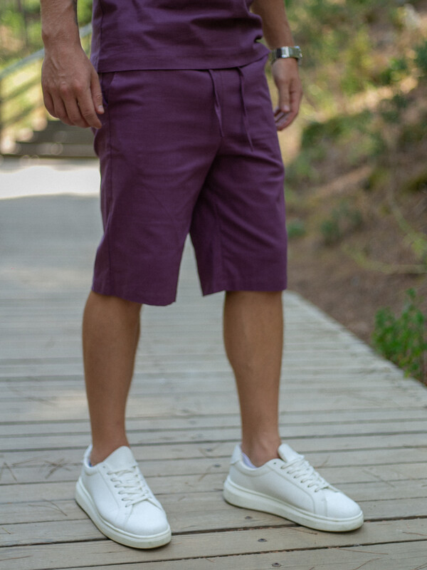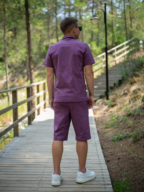 Чоловічий костюм Intruder фіолетового кольору — стильне рішення для весняно-літнього сезону. Комплект із натурального льону поєднує комфорт і практичність. Прямий крій забезпечує свободу рухів, а повсякденний стиль підходить для будь-яких завдань. Комір застібається на три кнопки, додаючи образу акуратності та сучасності. Шорти з резинкою та шнурком надійно фіксуються на талії. Два прорізні кишені забезпечують зручність для дрібниць. Цей костюм ідеально підійде для прогулянок, відпочинку та зустрічей.
