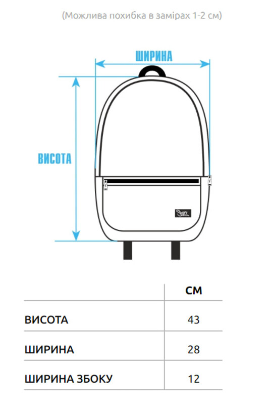 - розмір: висота 43 см, ширина 28 см, ширина збоку 12 см;
