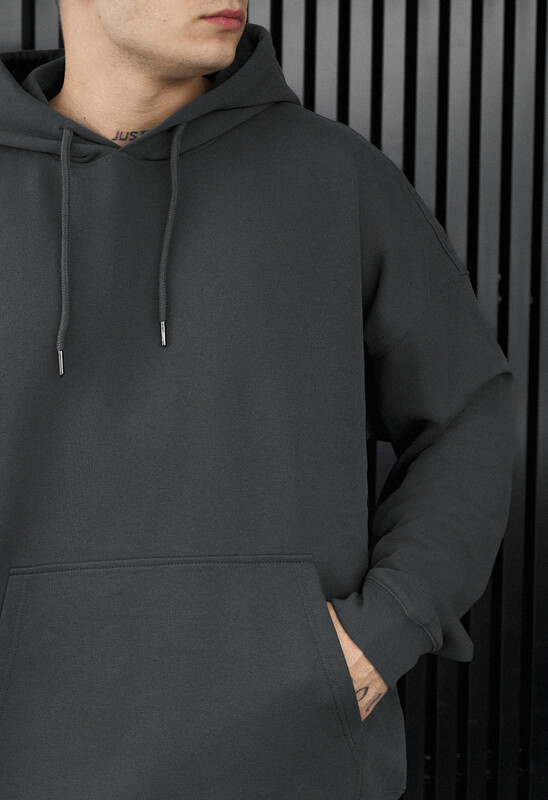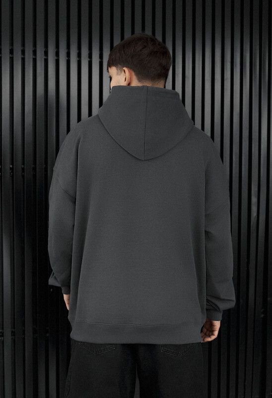 Темно-сіре худі в посадці oversize створене для стильних та комфортних повсякденних образів. Вільний крій, регульований шнурком капюшон і еластичні манжети забезпечують свободу рухів, а кишеня-кенгуру додає практичності. Виготовлене з 100% преміальної європейської бавовни, м’яке на дотик і стійке до зношування, худі стане універсальним елементом гардероба для цілорічного використання. Лаконічна бірка з логотипом у боковому шві підкреслює увагу до деталей і сучасний стиль.
