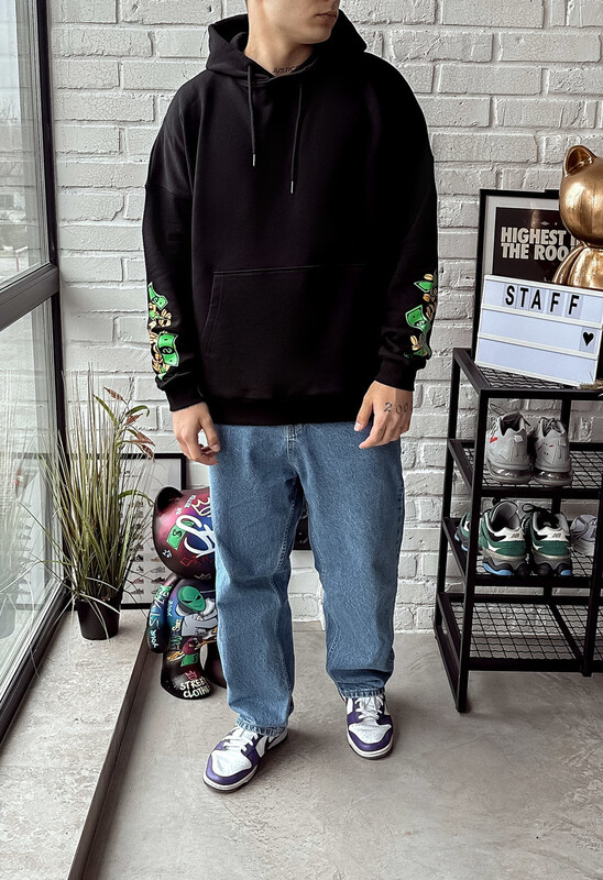 Oversize худі з капюшоном на шнурку, еластичними манжетами та ексклюзивними принтами забезпечить яскравий та стильний образ.