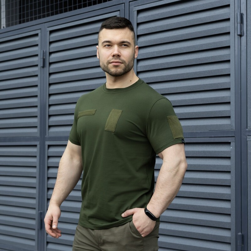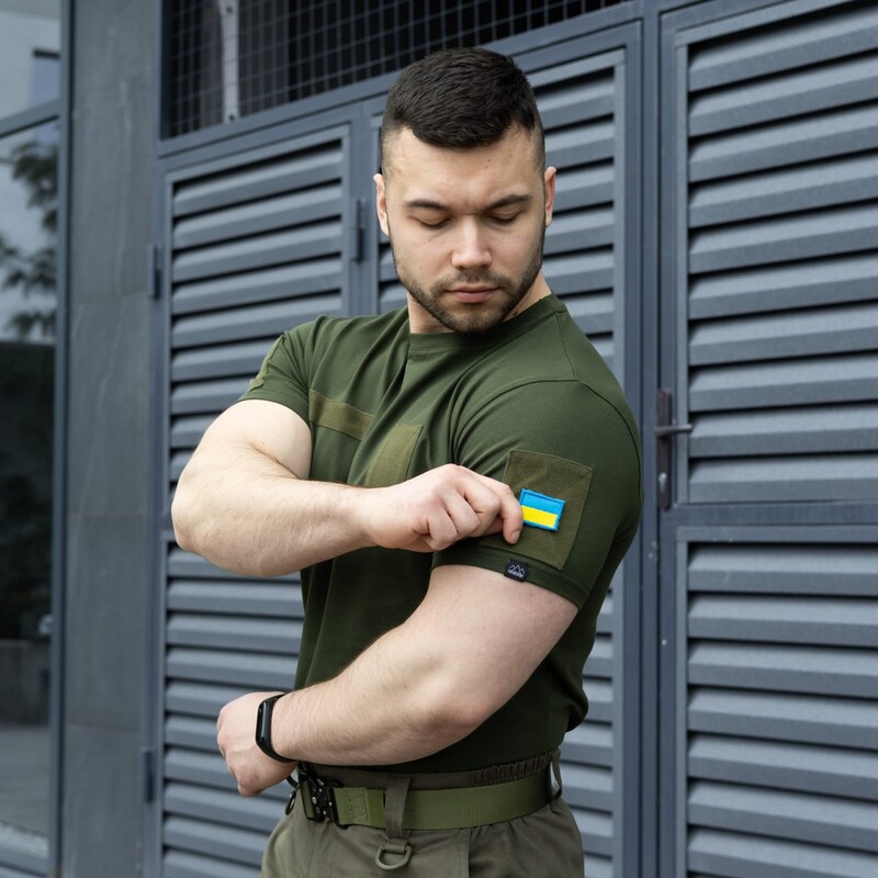 На грудях та рукавах передбачено панелі велкро для кріплення шевронів та відзнак. В комплекті до футболки йде один шеврон - прапор України. Завдяки унікальній розробці крою, футболка ідеально сідає по фігурі і в той же час не сильно облягає, зберігаючи по
