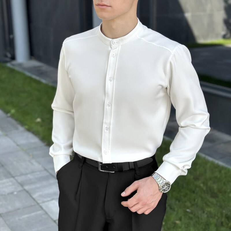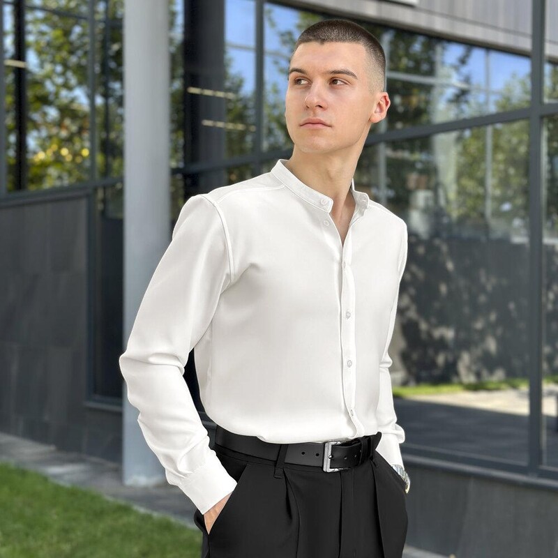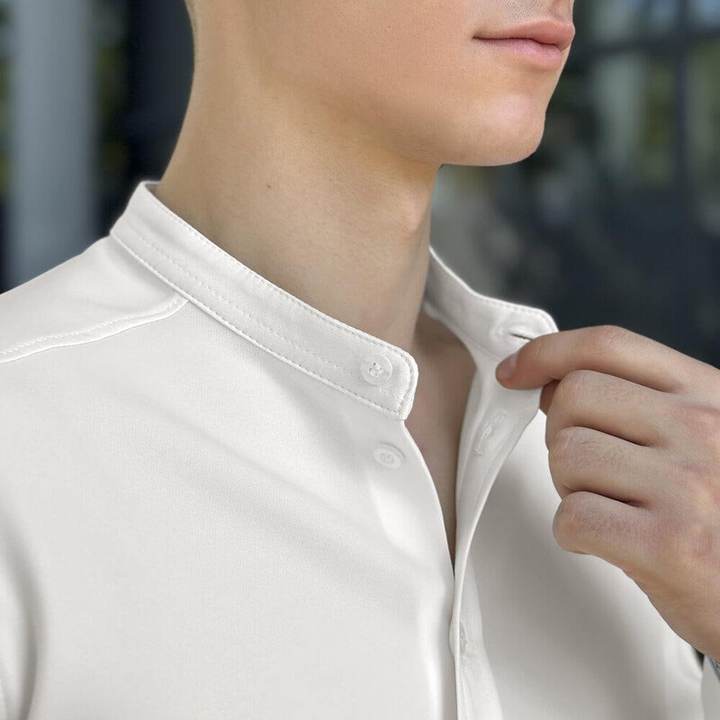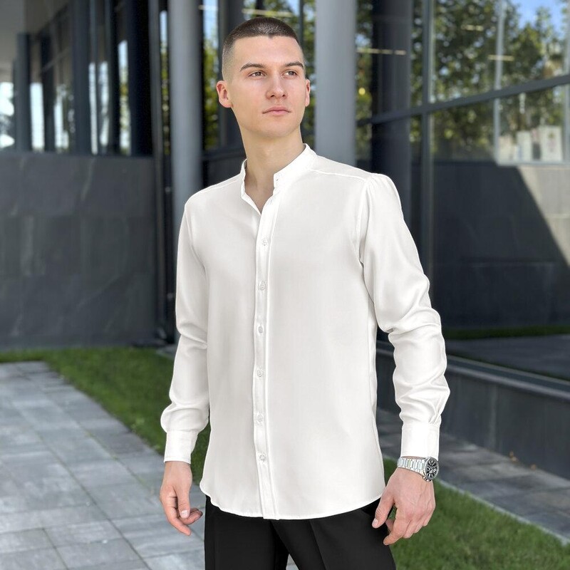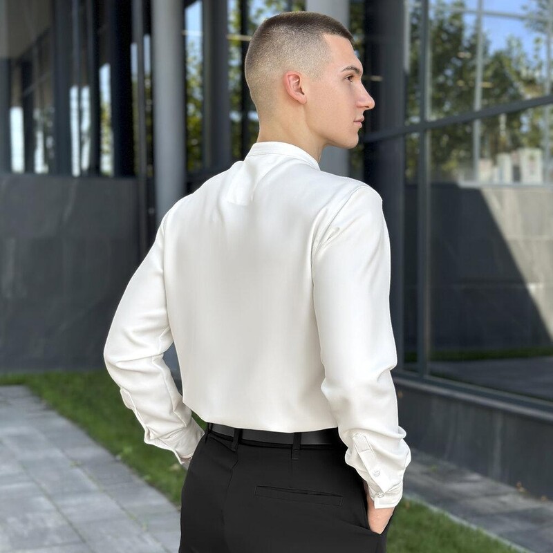 Молочна сорочка Pobedov Legend — це вибір для тих, хто хоче додати в гардероб світле, елегантне та універсальне рішення. Костюмна тканина гарно лягає по тілу, а сатиновий ефект робить її особливо виразною при природному освітленні. Прямий крій гарантує зручність, комір-стійка додає сучасності та охайності. Ґудзикова застібка по всій довжині та на манжетах — це зручно і формує завершений силует. Світлий відтінок легко поєднується з будь-якою палітрою одягу, виглядає свіжо та актуально.