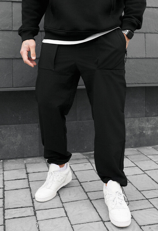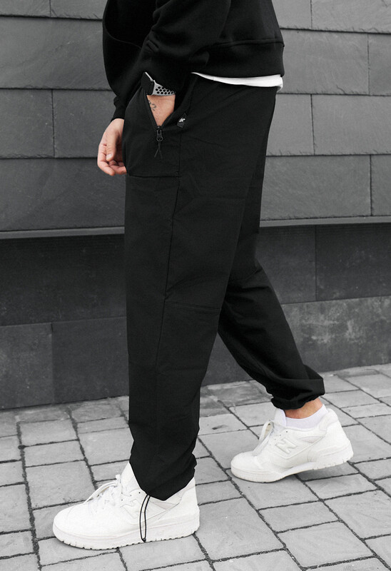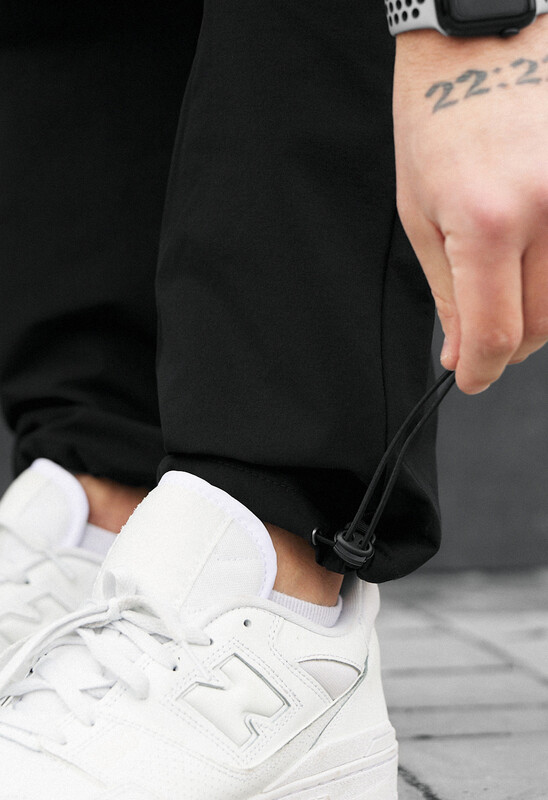 Чорні штани в мінімалістичному стилі поєднують універсальність і практичність для повсякденного та спортивного образу. Легкий матеріал з нейлону та еластану швидко сохне, стійкий до зминання й витримує інтенсивне використання. Класичний крій доповнено двома кишенями на блискавці та еластичним поясом на ґудзику. Стяжки внизу штанин дозволяють регулювати ширину й створювати сучасні силуети. На фото модель 183/78 у розмірі L.