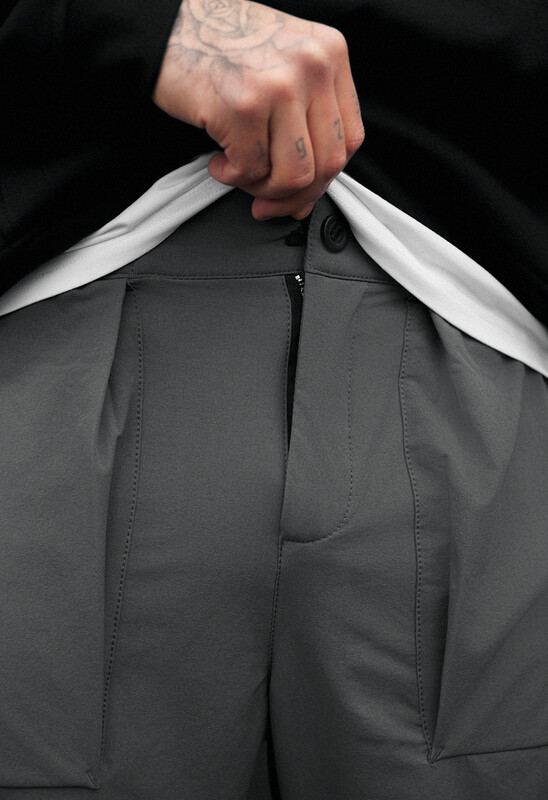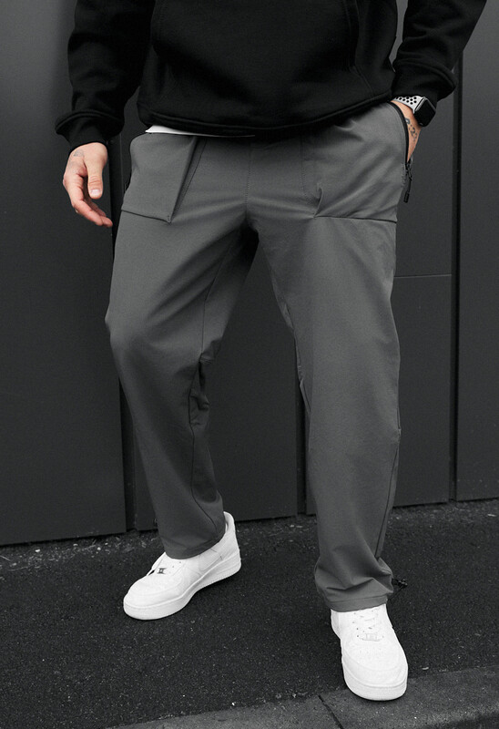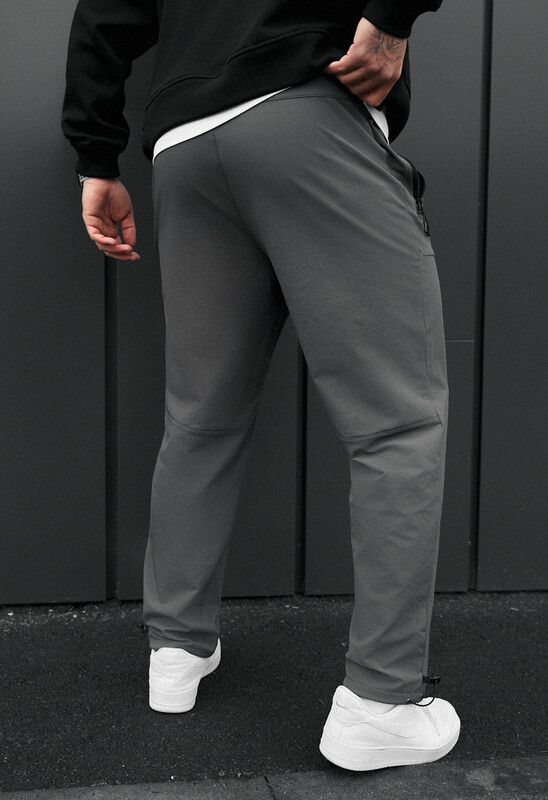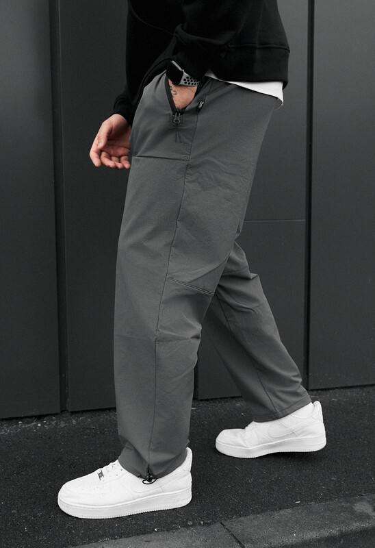 Сірі штани в мінімалістичному стилі поєднують практичність і універсальність для повсякденного та спортивного образу. Легкий нейлон з еластаном швидко сохне, стійкий до зминання й витримує інтенсивне використання. Класичний крій доповнено двома кишенями на блискавці та еластичним поясом на ґудзику. Регульовані стяжки внизу штанин дозволяють створювати стильні силуети. На фото модель 183/78, розмір L.