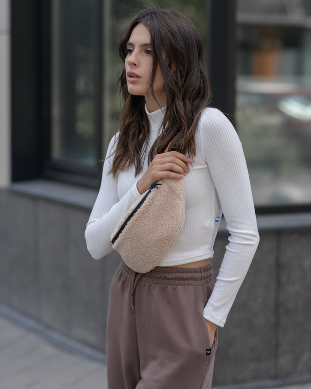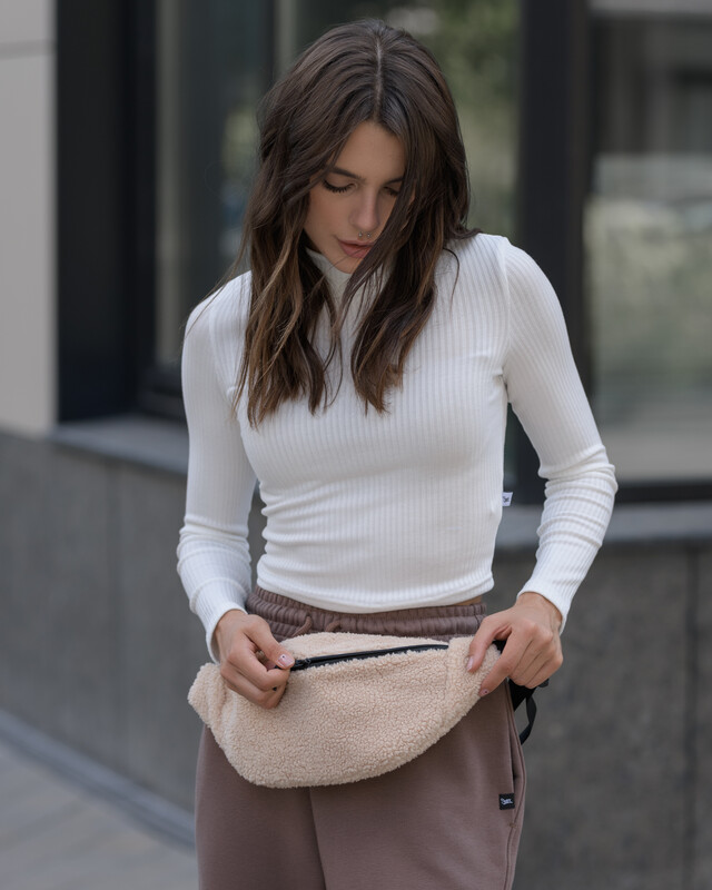 Легка поясна сумка із м'якої штучної овчини дозволить вмістити все необхідне для прогулянки. Завдяки зручному розміру вона чудово фіксується як на талії, так і на грудях, а прорізна кишеня на блискавці всередині дозволить легко сховати ключі або гаманець, відокремивши їх від решти речей.