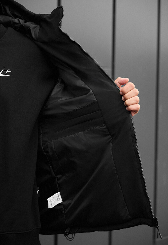 - висока горловина переходить у капюшон, об'єм якого допомагають регулювати шнури із пластиковими фіксаторами;
