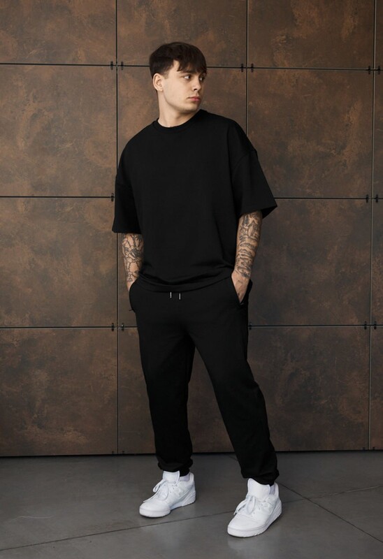 Чорний спортивний костюм поєднує сучасний стиль і комфорт для щоденного носіння. М’який щільний трикотаж на основі бавовни з додаванням поліестеру та еластану забезпечує еластичність, добре тримає форму й приємний до тіла. Футболка у крої oversize з круглим вирізом додає свободи рухів, а штани з еластичним поясом на шнурку та манжетами гарантують зручну посадку. Дві кишені на блискавці роблять модель практичною. Костюм легко комбінується як у комплекті, так і окремо, створюючи стильні образи для міста, відпочинку чи активного дня.
