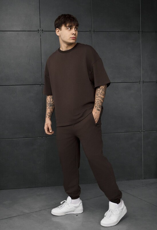 Темно-коричневий спортивний костюм поєднує сучасний стиль і максимальний комфорт для щоденного носіння. Щільний гладкий трикотаж на основі бавовни з додаванням поліестеру та еластану добре тягнеться, приємний до тіла й довго зберігає форму. Футболка у крої oversize з круглим вирізом забезпечує свободу рухів, а штани з еластичним поясом на шнурку та манжетами гарантують зручну посадку. Дві кишені на блискавці додають практичності. Костюм легко комбінується як у комплекті, так і окремо, створюючи стильні повсякденні образи.