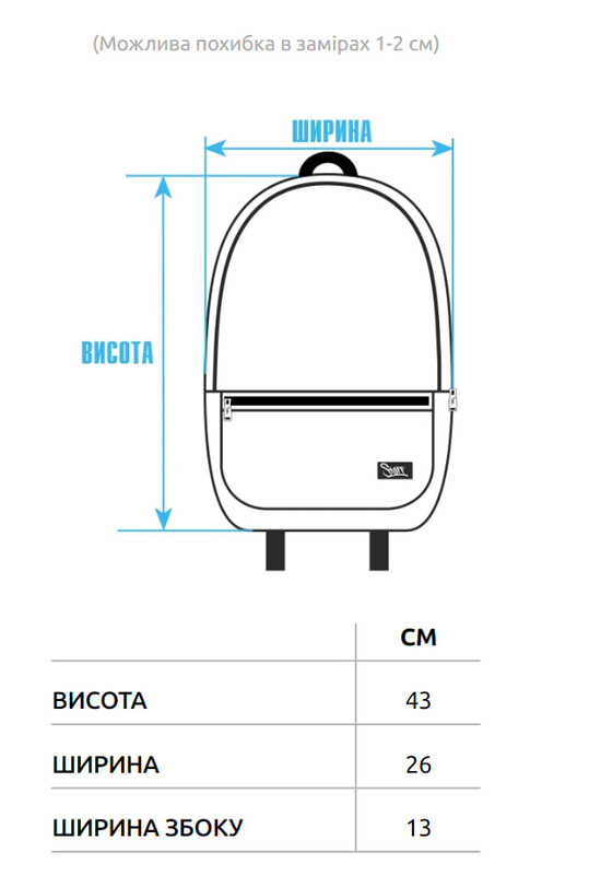 - розмір: висота 43 см, ширина 26 см, ширина збоку 13 см;