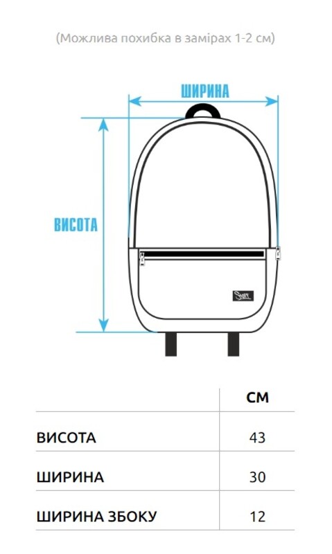 - розмір: висота 43 см, ширина 30 см, ширина збоку 12 см;