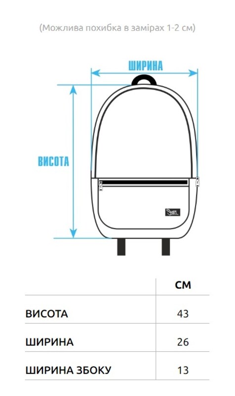 - розмір: висота 43 см, ширина 26 см, ширина збоку 13 см;