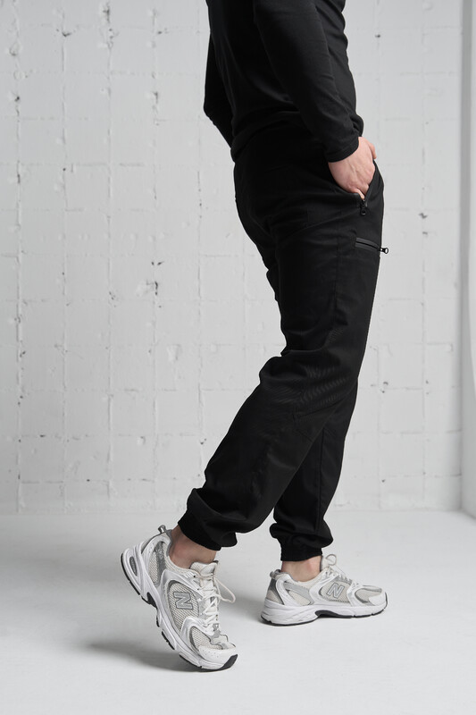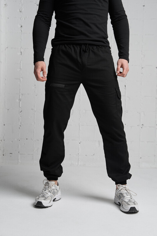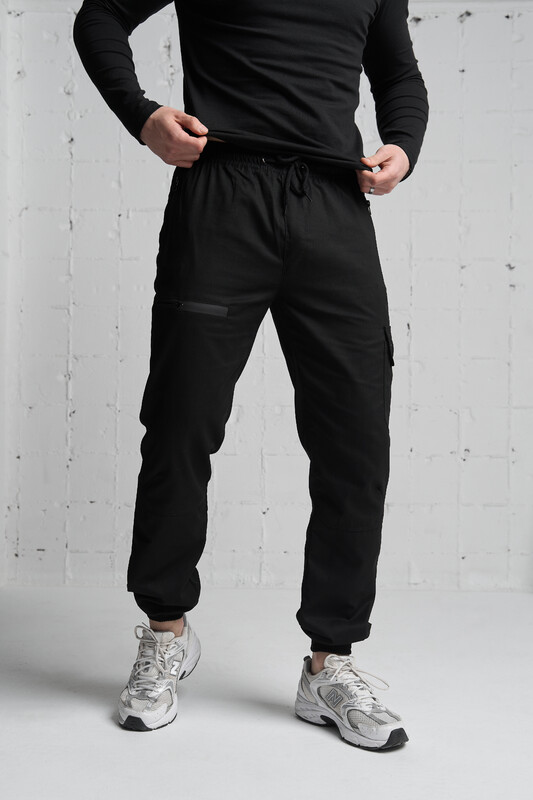 У поясі регулюються за допомогою резинки і шнурка. Дві прорізні бічні кишені на блискавці та накладна кишеня на липучці. Внизу манжети на резинці