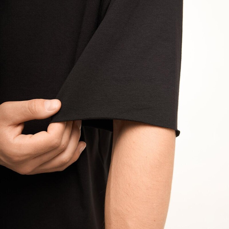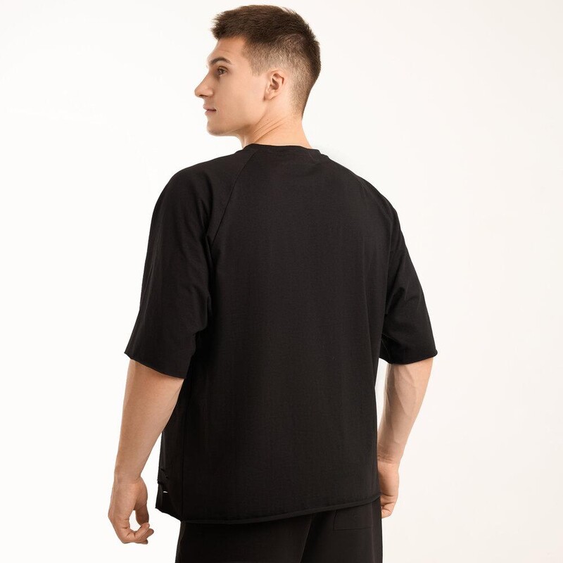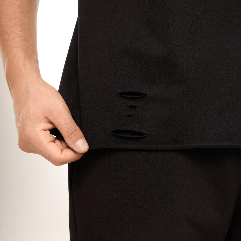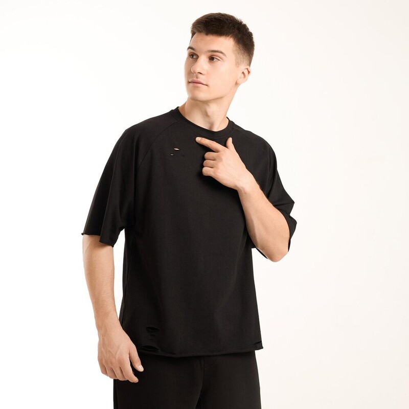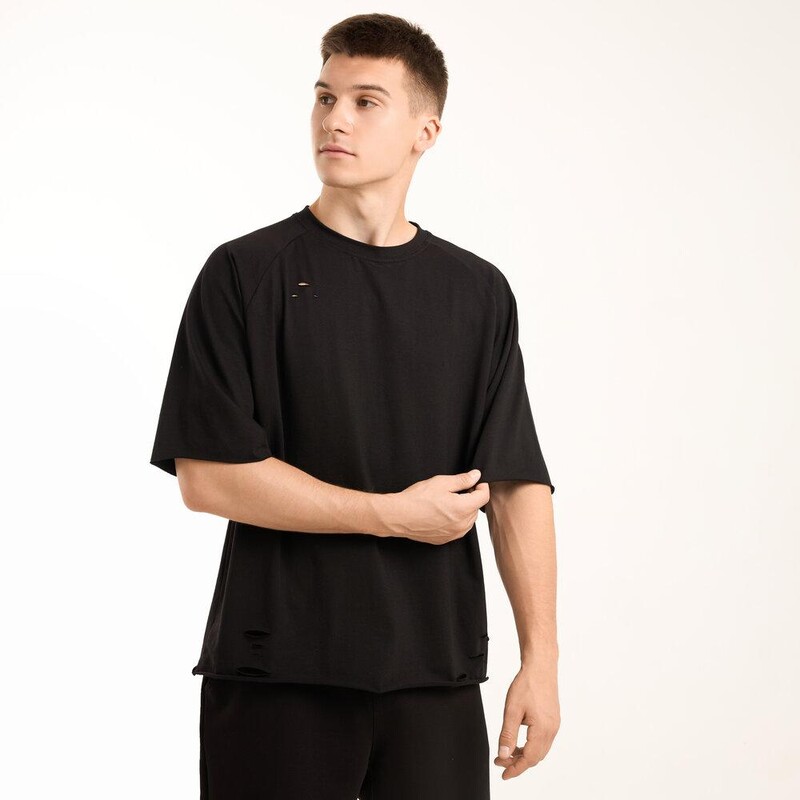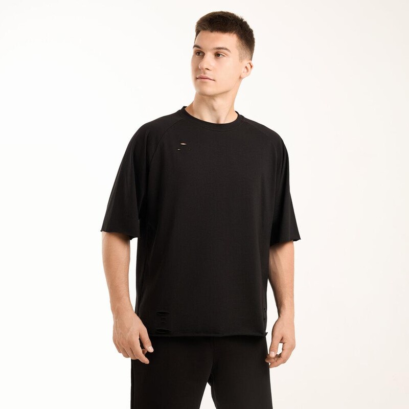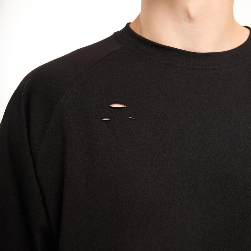 Ця чорна футболка від Pobedov — це втілення вуличного стилю та брутальної естетики. Вона створена для тих, хто не боїться виділятися. Вільний крій у поєднанні з рукавами-реглан забезпечує максимальний комфорт і повну свободу рухів протягом усього дня. Але головні акценти, що роблять цю модель унікальною, — це декоративні прорізи в зоні грудей та по низу, які додають характеру, та відкриті шви на рукавах і краю виробу. Ці трендові деталі підкреслюють бунтарський streetwear вайб. Виготовлена з високоякісного турецького куліру (95% бавовна + 5% еластан), ця футболка не лише стильна, а й приємна до тіла. Це оригінальний продукт від українського виробника, що гарантує відмінну фабричну якість.