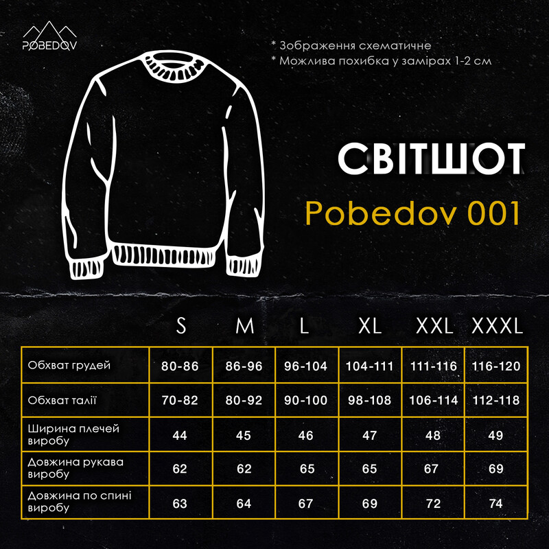 Матеріал: якісна європейська бавовна без начісу (європейський трикотаж двунитка пен'є без утеплювача). Круглий виріз горловини. Високоякісна резинка по нижньому краю та низу рукавів. Фірмова жаккардова бирка Pobedov