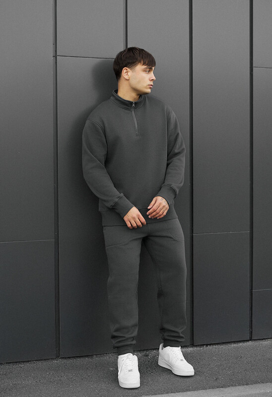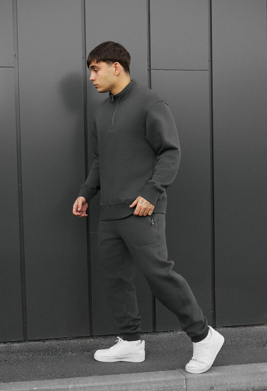 Темно-сірий утеплений спортивний костюм поєднує комфорт і лаконічний стиль. М’який мікрофліс усередині зберігає тепло навіть у найпрохолодніші дні, а щільна бавовна європейської якості забезпечує міцність і приємні тактильні відчуття. Олімпійка зі спущеними плечима та високою горловиною створює стильний силует і захищає від вітру. Штани з накладними кишенями на тракторній блискавці та еластичним поясом доповнюють образ практичністю. Глибокий темно-сірий відтінок додає костюму універсальності й елегантності в сезоні осінь/зима.