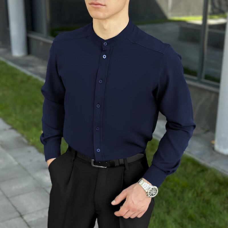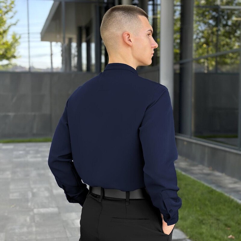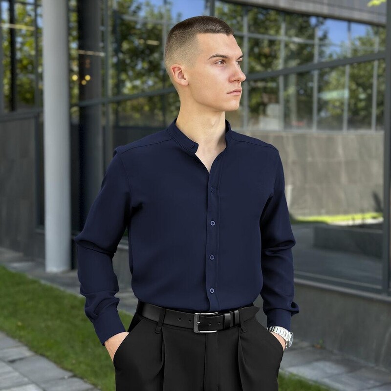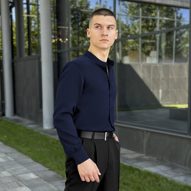 Темно-синя сорочка Pobedov Legend — стильна альтернатива чорній, яка зберігає строгість, але додає індивідуальності. Костюмна тканина з сатиновим блиском підкреслює охайність крою і створює відчуття преміальності. Завдяки прямому силуету, сорочка зручно сидить на тілі та дозволяє вільно рухатися. Комір-стійка робить образ більш інтелігентним, а застібка на ґудзики, включно з манжетами, завершує дизайн з особливою увагою до деталей. Темно-синій колір чудово поєднується з базовими відтінками і підкреслює смак власника. Ця модель легко стане улюбленим елементом гардеробу для ділових образів, неформальних зустрічей і повсякденного носіння.