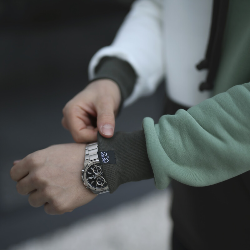 Манжети рукавів та нижній край виконані з еластичної трикотажної резинки, яка щільно прилягає до тіла, захищаючи від вітру та холоду. Жакардова бірка Pobedov на манжеті лівого рукава підкреслює оригінальність моделі та її зв’язок з брендом.