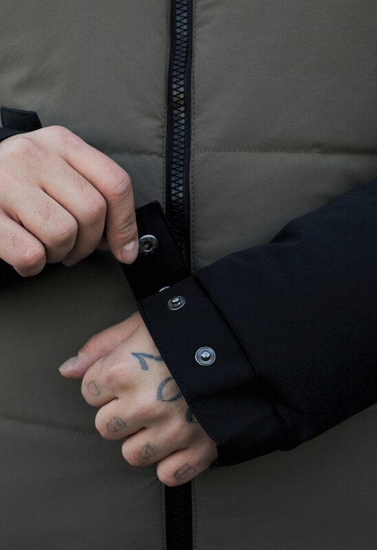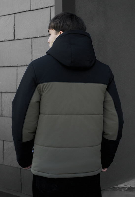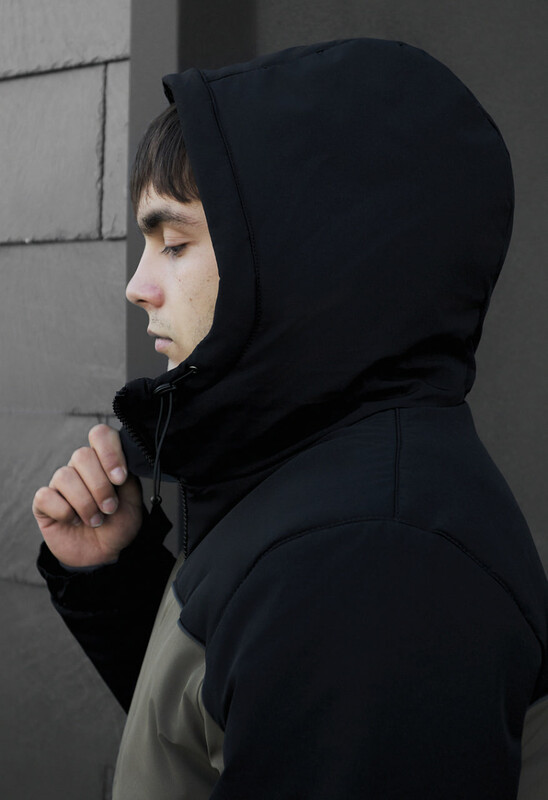 - висока горловина переходить у капюшон, об'єм якого допомагають регулювати шнури з пластиковими фіксаторами;