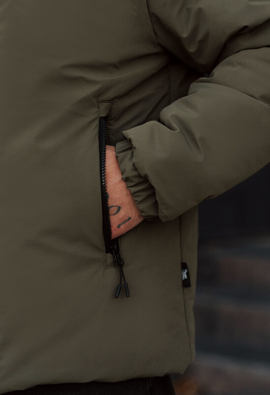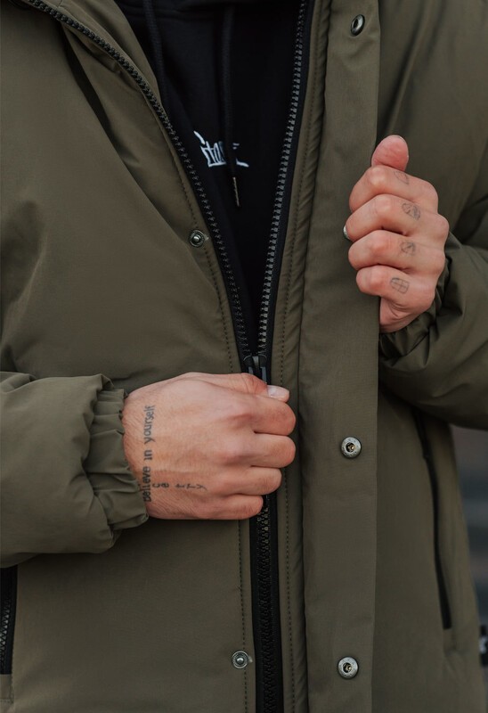 - висока горловина переходить у капюшон, об'єм якого допомагають регулювати шнури з пластиковими фіксаторами;