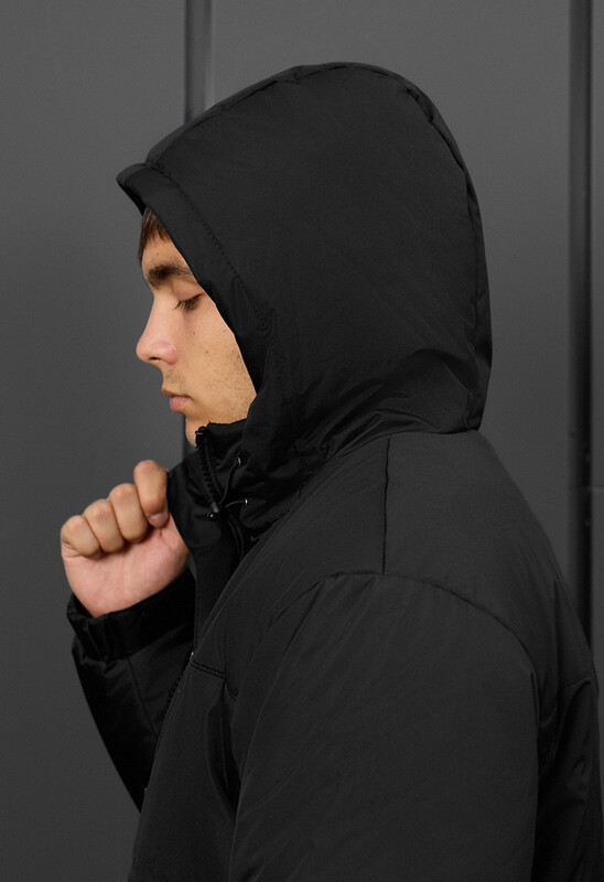 - висока горловина переходить у капюшон, об'єм якого допомагають регулювати шнури із пластиковими фіксаторами;