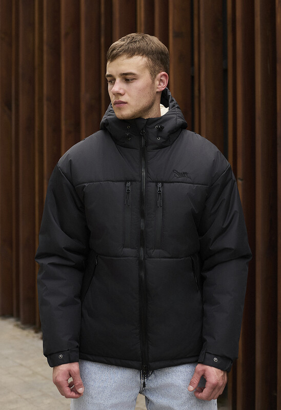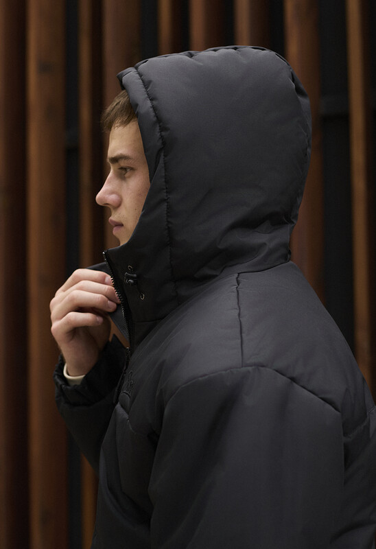 - висока горловина переходить у капюшон, об'єм якого допомагають регулювати шнури із пластиковими фіксаторами;
