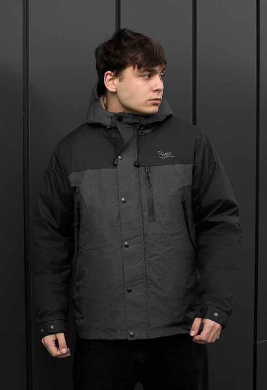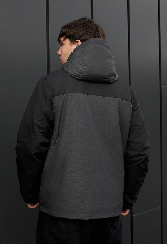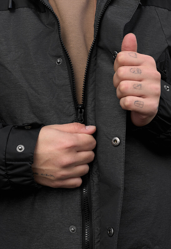 - Высокая горловина переходит в капюшон, ширина которого регулируется эластичной стяжкой с пластиковыми фиксаторами;