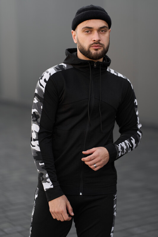 Капюшон вшит, регулируется завязками. По всей длине рукава вставка из камуфлированного трикотажа.