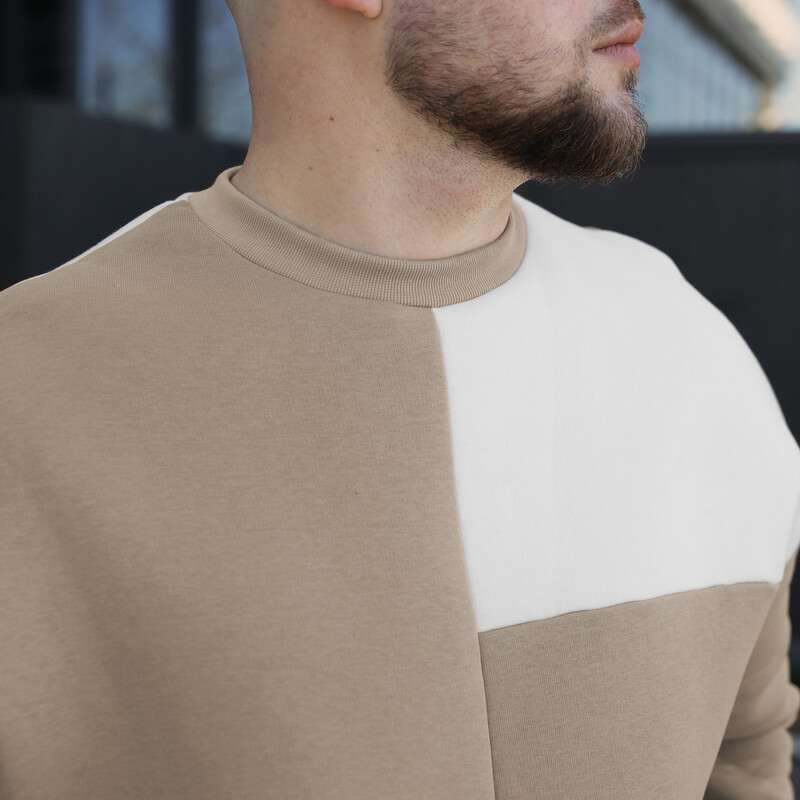 Модель в стиле oversize с приспущенным рукавом дарит свободу движениям, а контрастное сочетание двух цветов создает современный и выразительный образ.