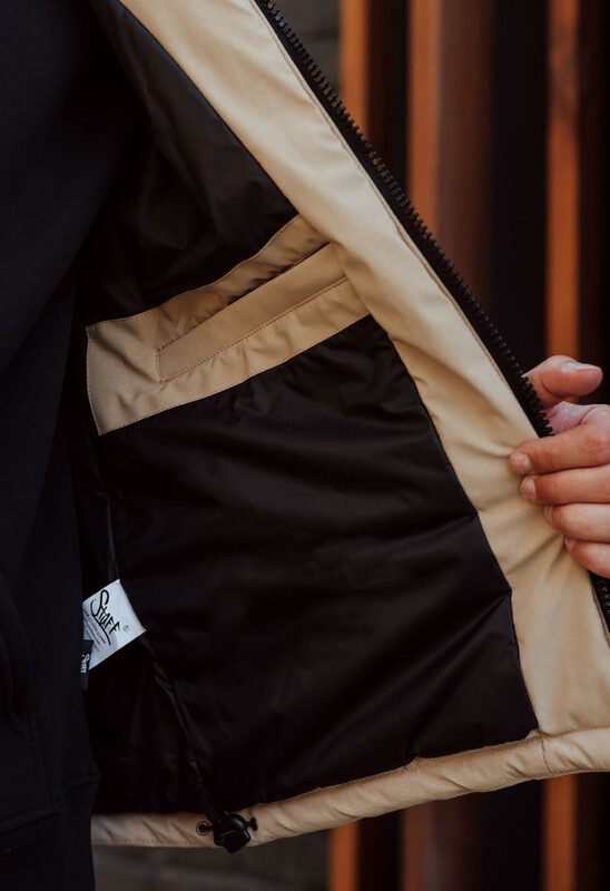 - высокая горловина переходит в капюшон, объём которого помогают регулировать шнуры с пластиковыми фиксаторами;
