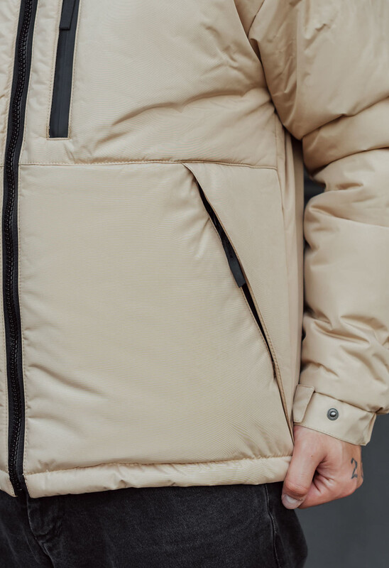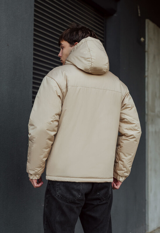 - висока горловина переходить у капюшон, об'єм якого допомагають регулювати шнури із пластиковими фіксаторами;