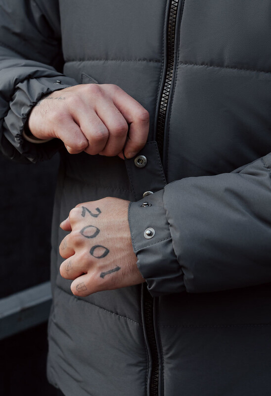- висока горловина переходить у капюшон, об'єм якого допомагають регулювати шнури із пластиковими фіксаторами;