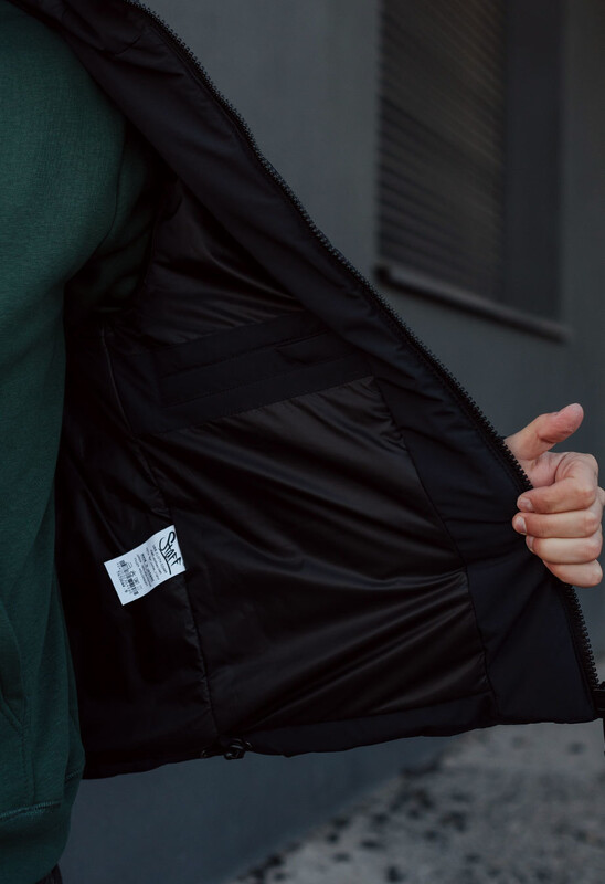 - висока горловина переходить у капюшон, об'єм якого допомагають регулювати шнури із пластиковими фіксаторами;